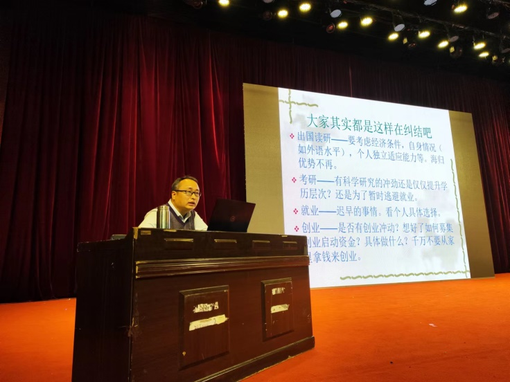 黄明亮副书记从应届毕业生出国留学、国内考研、就业和创业等四种毕业去向进行详细讲解,并分别对应往届毕业生的真实案例进行细致地分析,向大家介绍了公务员面试考核的注意事项表示有些同学在考研和就业过程中存在的盲目、等待、不就业慢就业等现象,让同学们对照自身的实际情况,确定适合自己的目标,做好毕业去向规划,克服从众心理,去选择最适合自己的毕业去向。