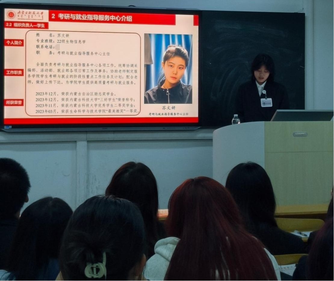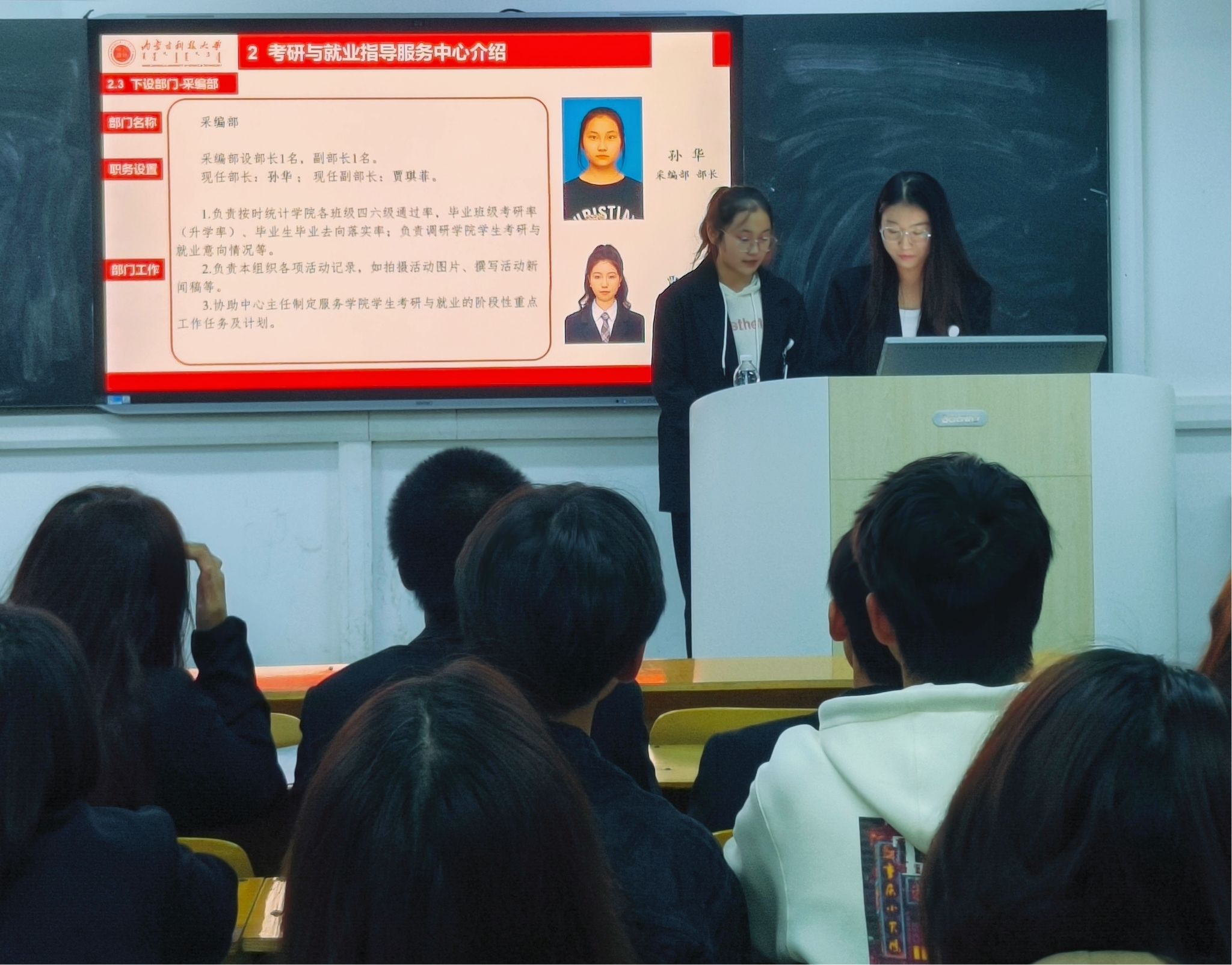 活动部部长郭建坤、副部长贾婧冉总结本部门职责为“向外收集考研就业信息+组织相关活动”,即收集推送考研、就业、考公考编、基层岗位报考等信息,组织开展考研就业相关讲座、经验分享会等工作。